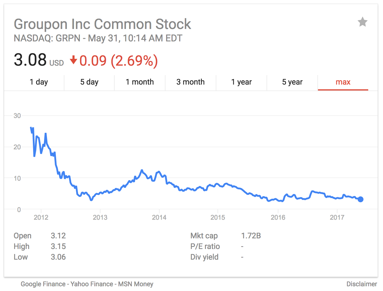 I remember the last time Chicago got frothy about the closest thing we’d had to a Silicon Valley success story: Groupon. The city rallied around it. Everyone hailed as the fastest growing company ever, and it raced to a $1 billion dollar valuation on waves of institutional investment. We celebrated around fastest growing, not profitable, not sustainable. And now just a few years later, you don’t hear many people talking about Groupon anymore — except when they need to show an example like the one below: